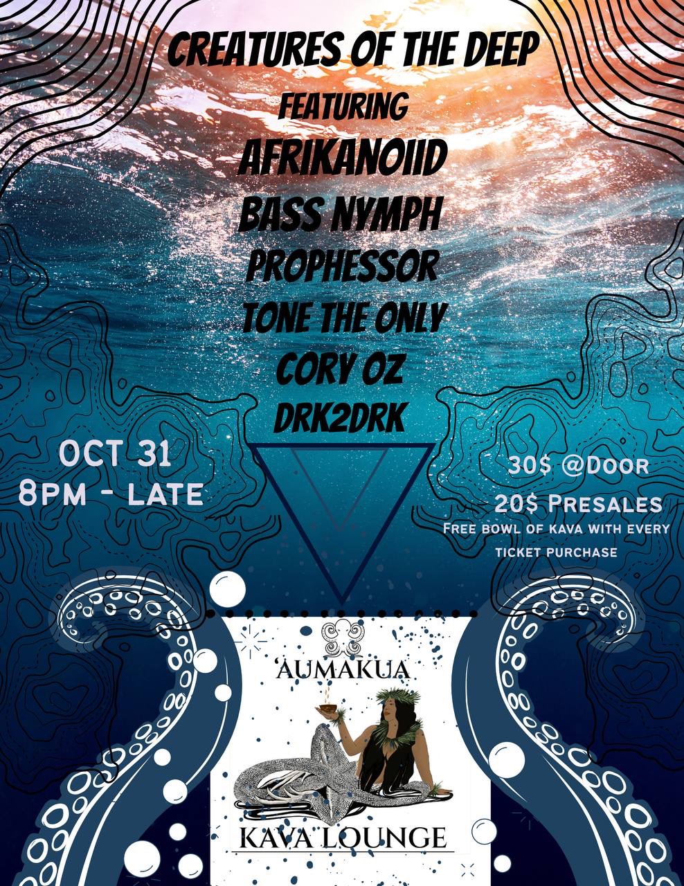 Salt & Sound Collective + Aumakua Kava invite you to a Hallow’s Eve of deep bass with a heavy rotation of local DJs and tasty kava potions. Dress to express! The theme is creatures of the deep— aquatic, extraterrestrial or otherwise!
